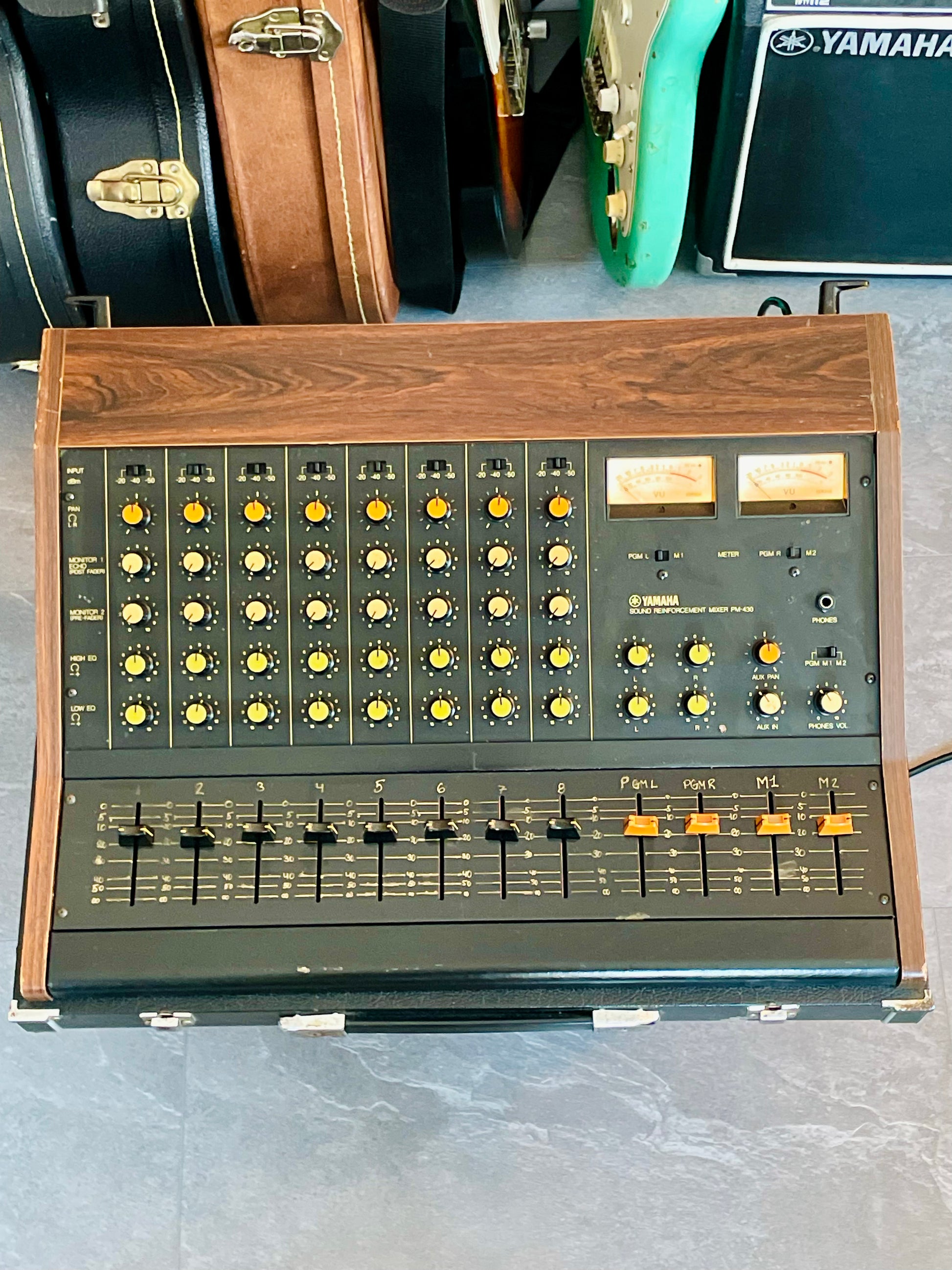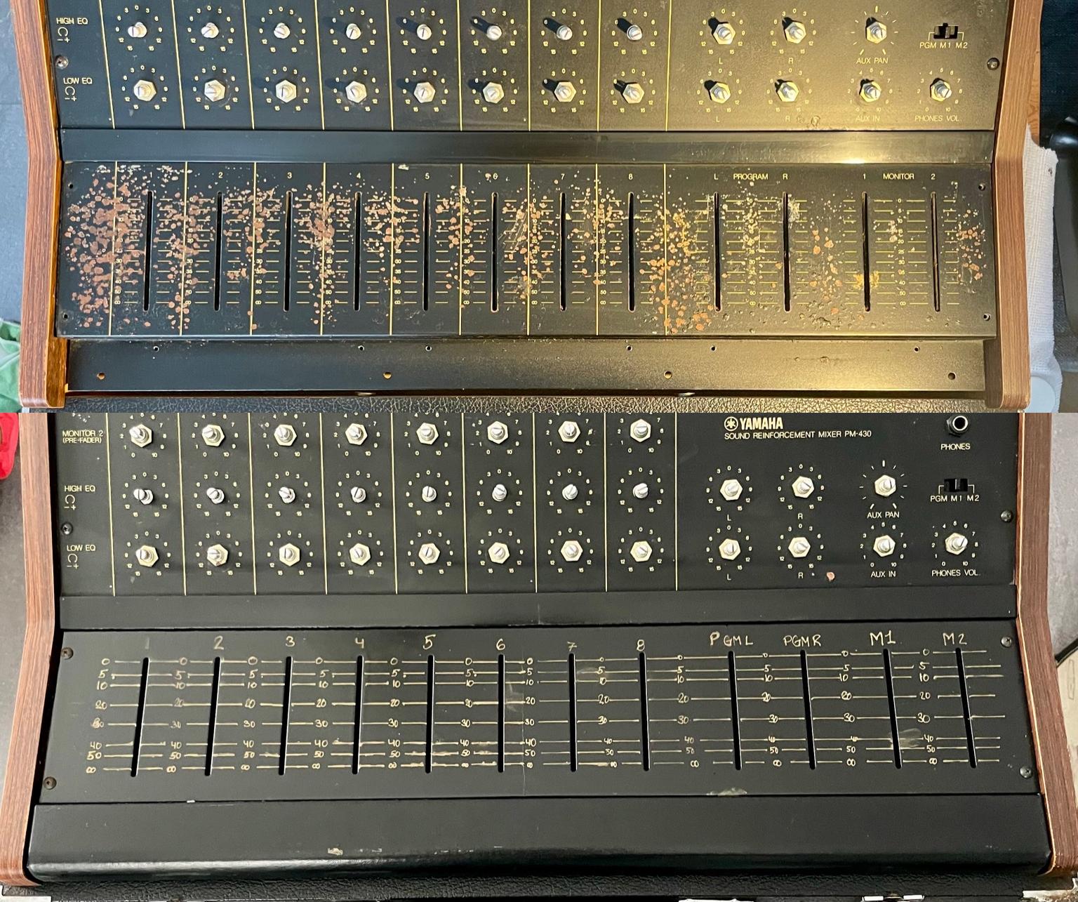 This Yamaha PM-430 has been fully serviced and recapped and now runs quietly, smoothly and reliably. All faders and potentiometers move cleanly without crackle and it is ready for many more decades of real analog duty.