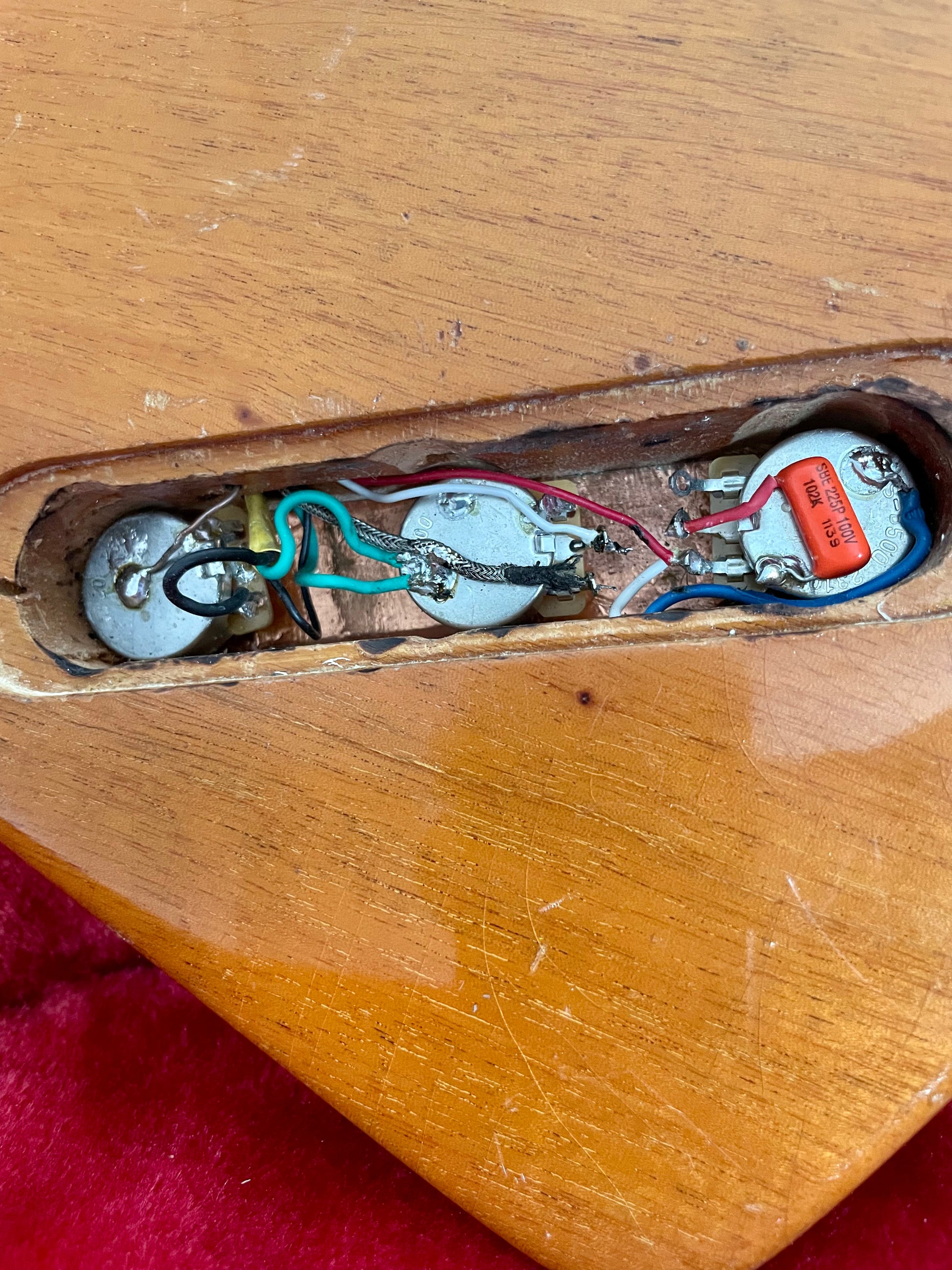 The hardware and pickups are original, and the pots where replaced by following the same audio/linear specs of the original set up. All of the electronics work as they should, with a three-way pickup selector, individual volume controls for each pickup and a master tone control.