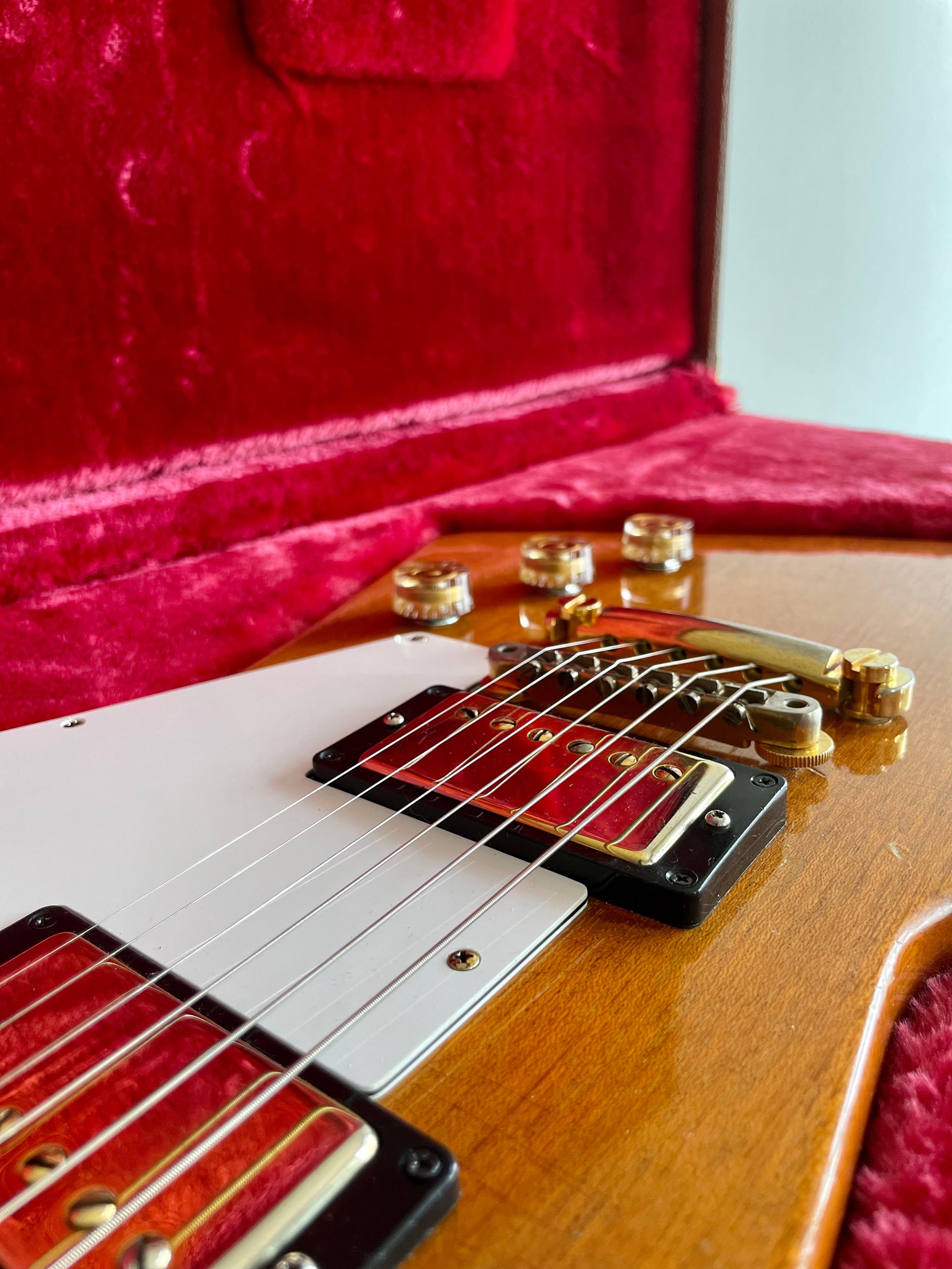 On the headstock, the original tuners have been replaced by previous owner who was luthier (Liberatore) and who bought the guitar back in 1976. He chose top of the line Schallers with clean gold plating made in West Germany probably before 1991. They are incredibly precise and hold tuning very well. On the back of the headstock can be found the 00 prefix, for the year 1976 along with it's Limited Edition badge.