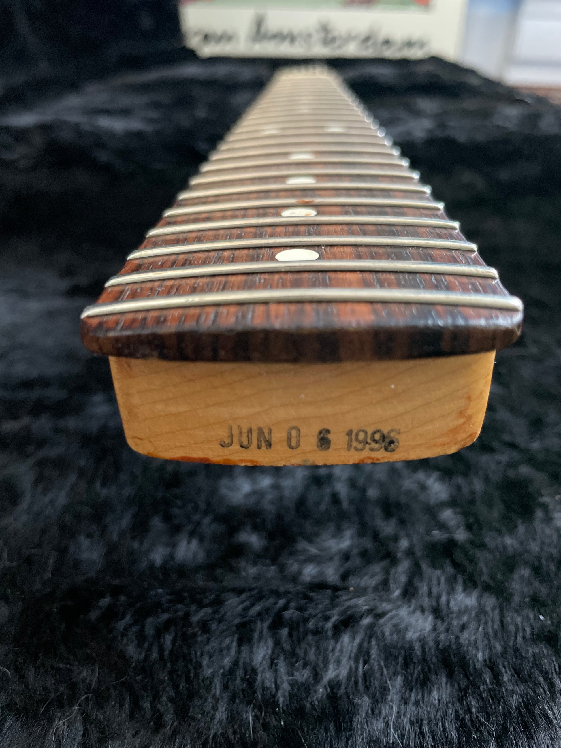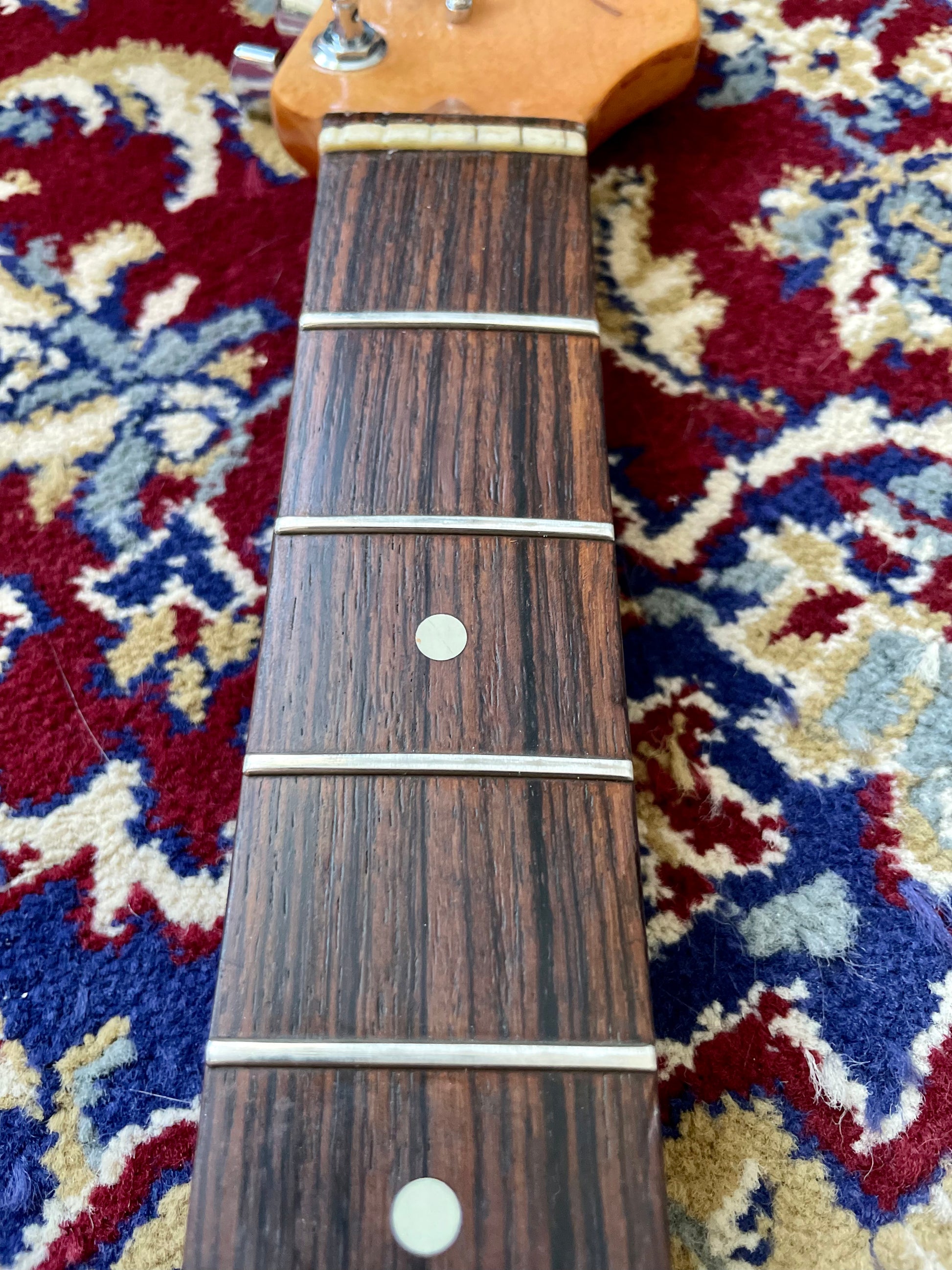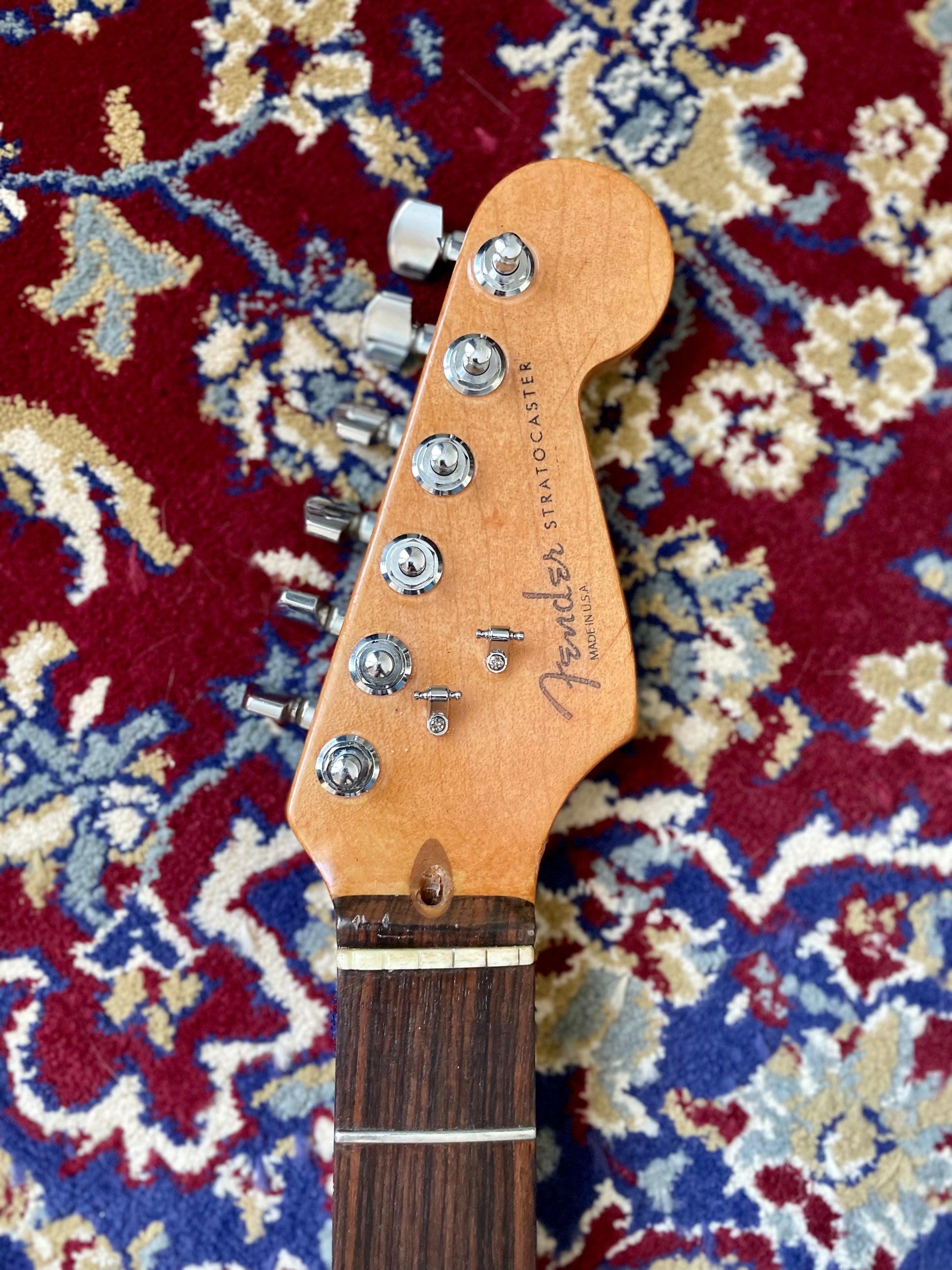The headstock is in good condition, but we need to mention that the finish on it is not an original fender finish. It is thicker than the finish on the neck of the guitar and has a shinier glow under light. There are no signs of a repair being done in that area whatsoever. There are small imperfections in the headstock finish near the tuners documented in the last 2 pictures and where you can see it's a bit thicker. It remains a highly attractive and reputable guitar!