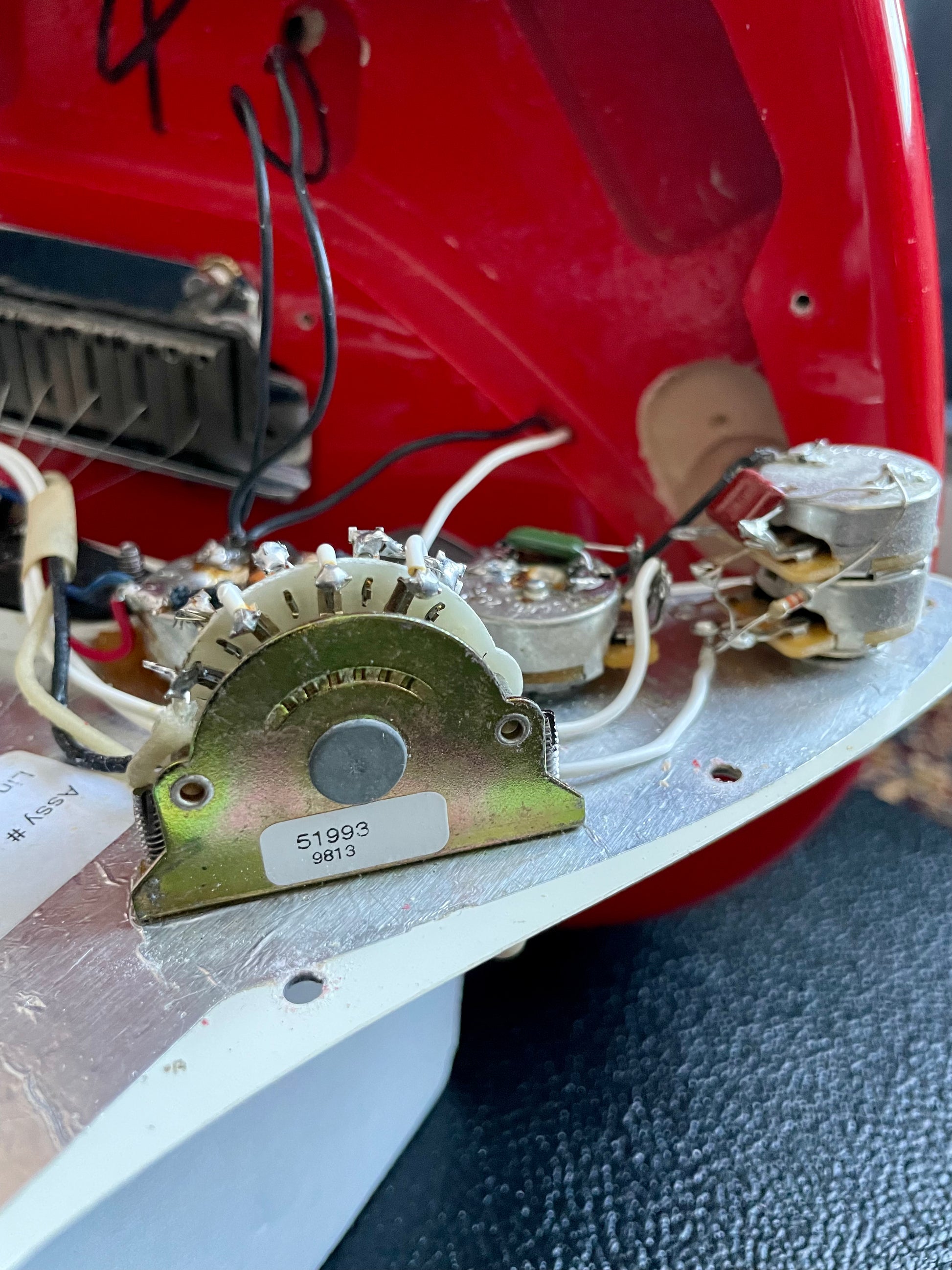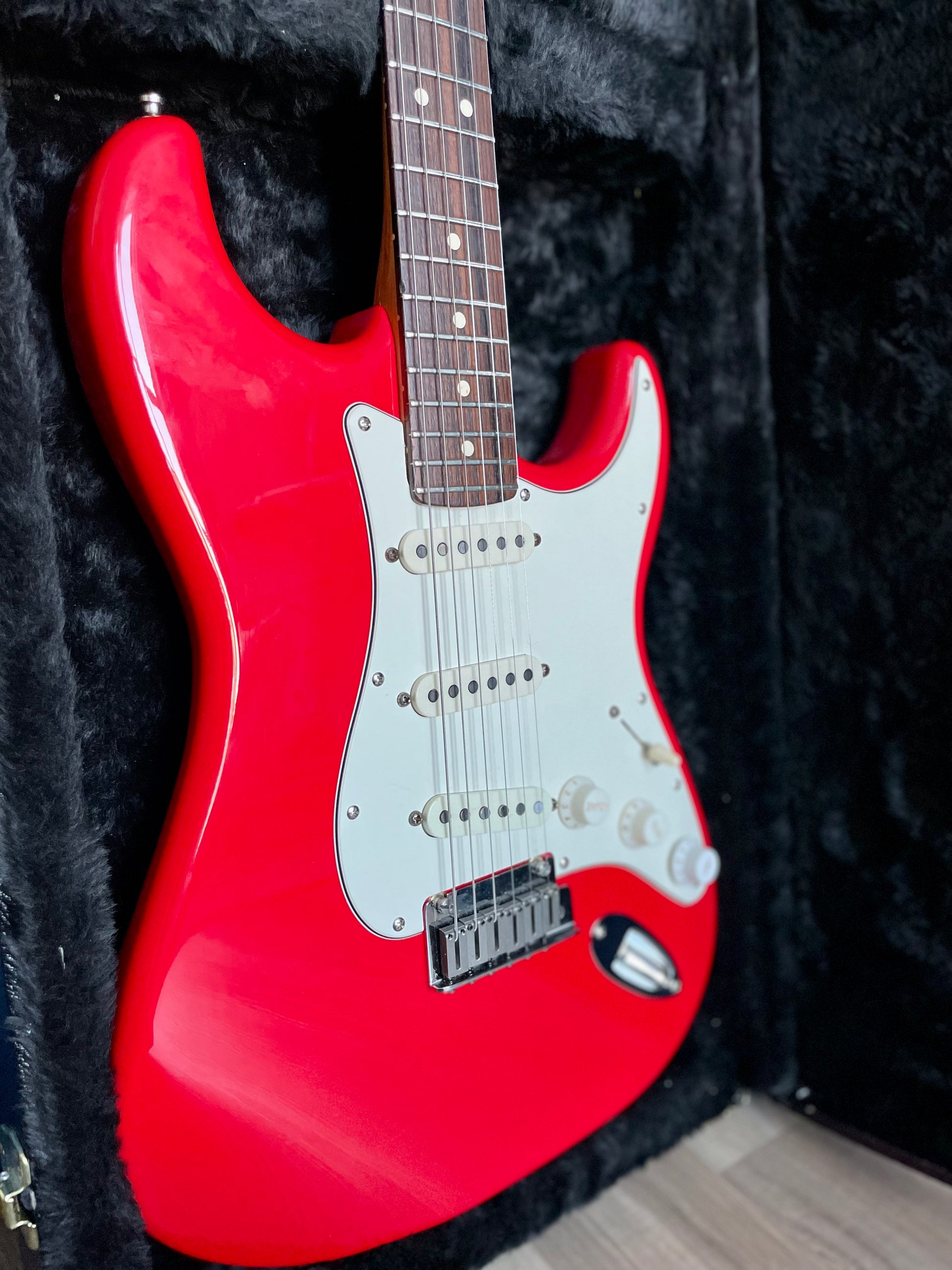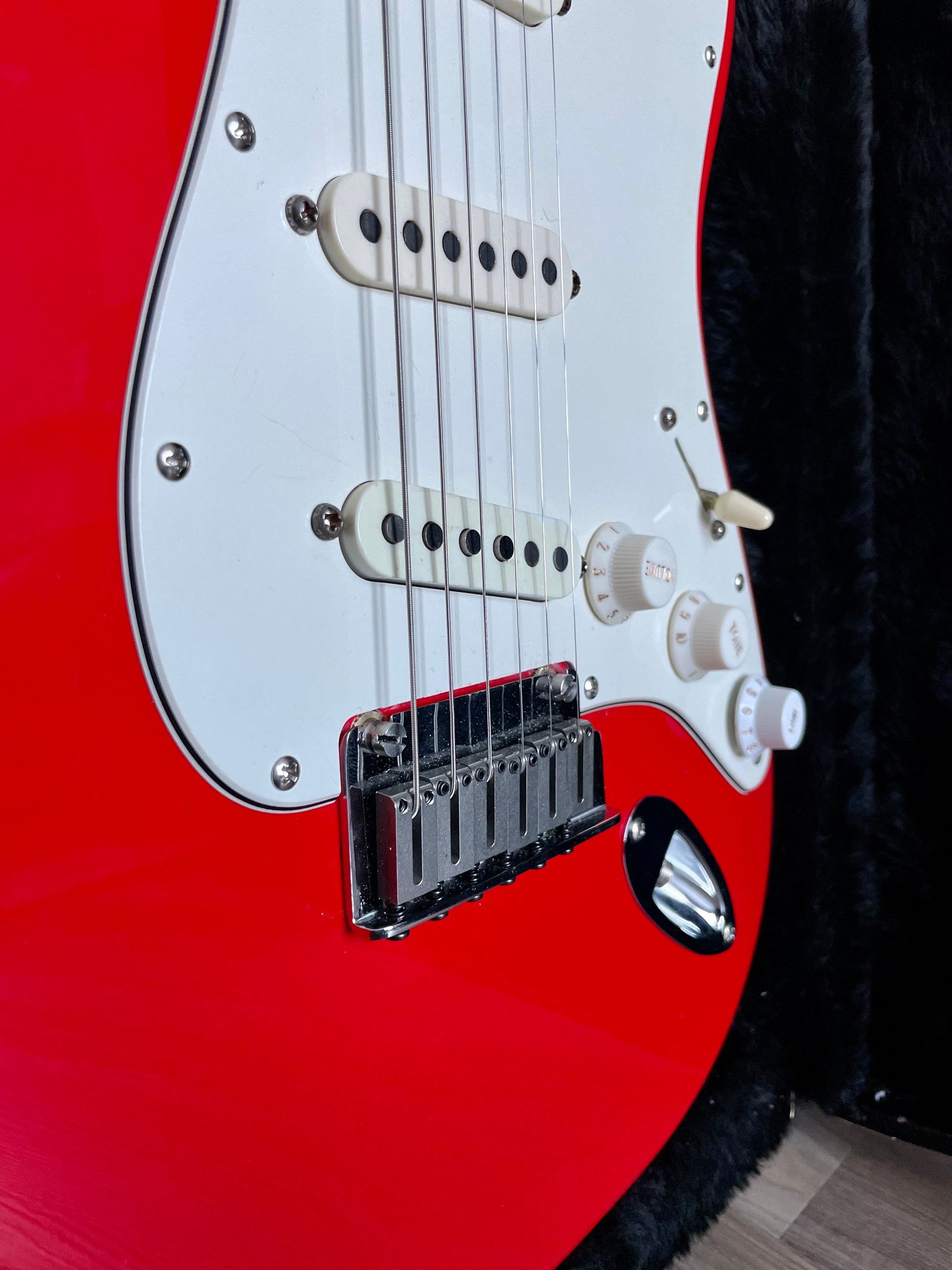 From the 90's, the body is still in mint condition, there are no scratches or dents. The hardware is fully-functional and practically new. Featuring a bolt-on construction comprising an Alder body under an appealing Hot Rod Red paint, Maple neck with Micro-tilt, carved into Fender's popular Modern 'C' profile and a 22 fret Rosewood fingerboard. The Rosewood fingerboard is pleasant to the touch, and with it's 9.5" radius offers a nice balance between comfortable chord playing and practicality for string bending. The frets in excellent condition. 2 point synchronized tremolo bridge, Fender standard sealed tuning machines. 90's bridge & tremolo quipped with brushed nickel saddles. SSS staggered pickup configuration. TBX Tone control circuit on the 2nd pickup position (Treble Bass Expander) when you rotate clockwise, the absence of lows makes glassy highs erupt!