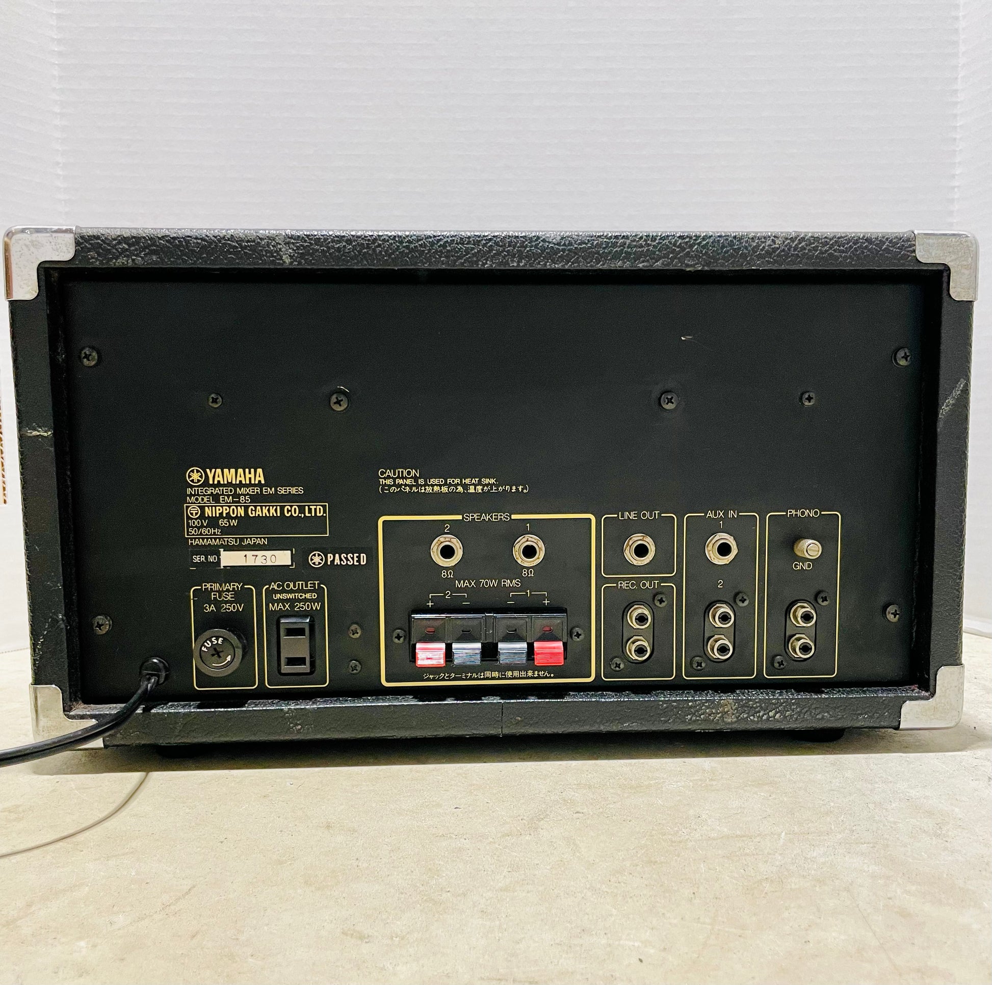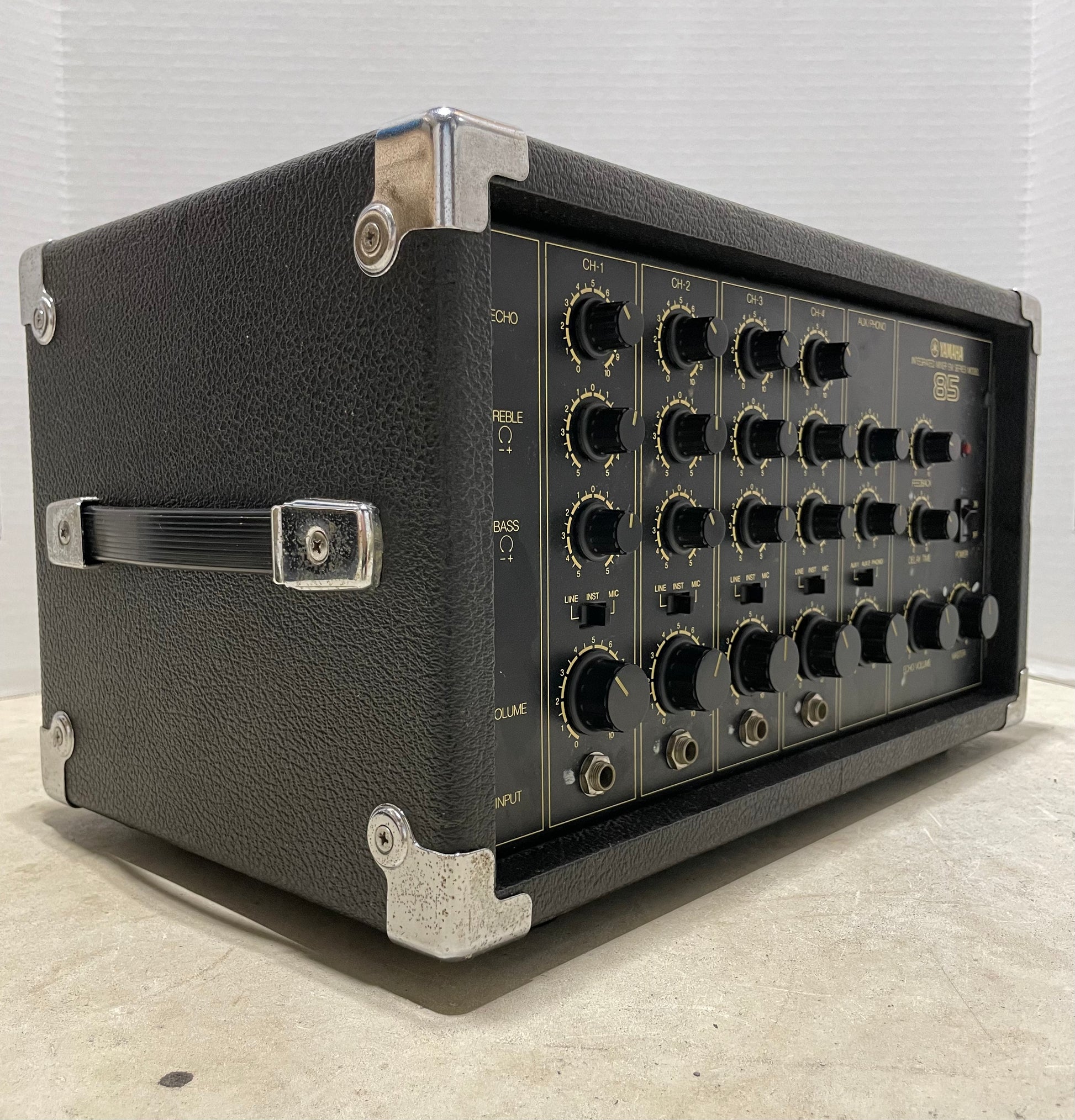 Vintage Yamaha EM-85 integrated powered mixer — a versatile 4-channel unit with Yamaha’s classic bucket-brigade delay/echo, built around the sought-after MN3005 BBD chip (also used in the EHX Deluxe Memory Man, Boss DM-2 [early versions], and Ibanez AD-202).