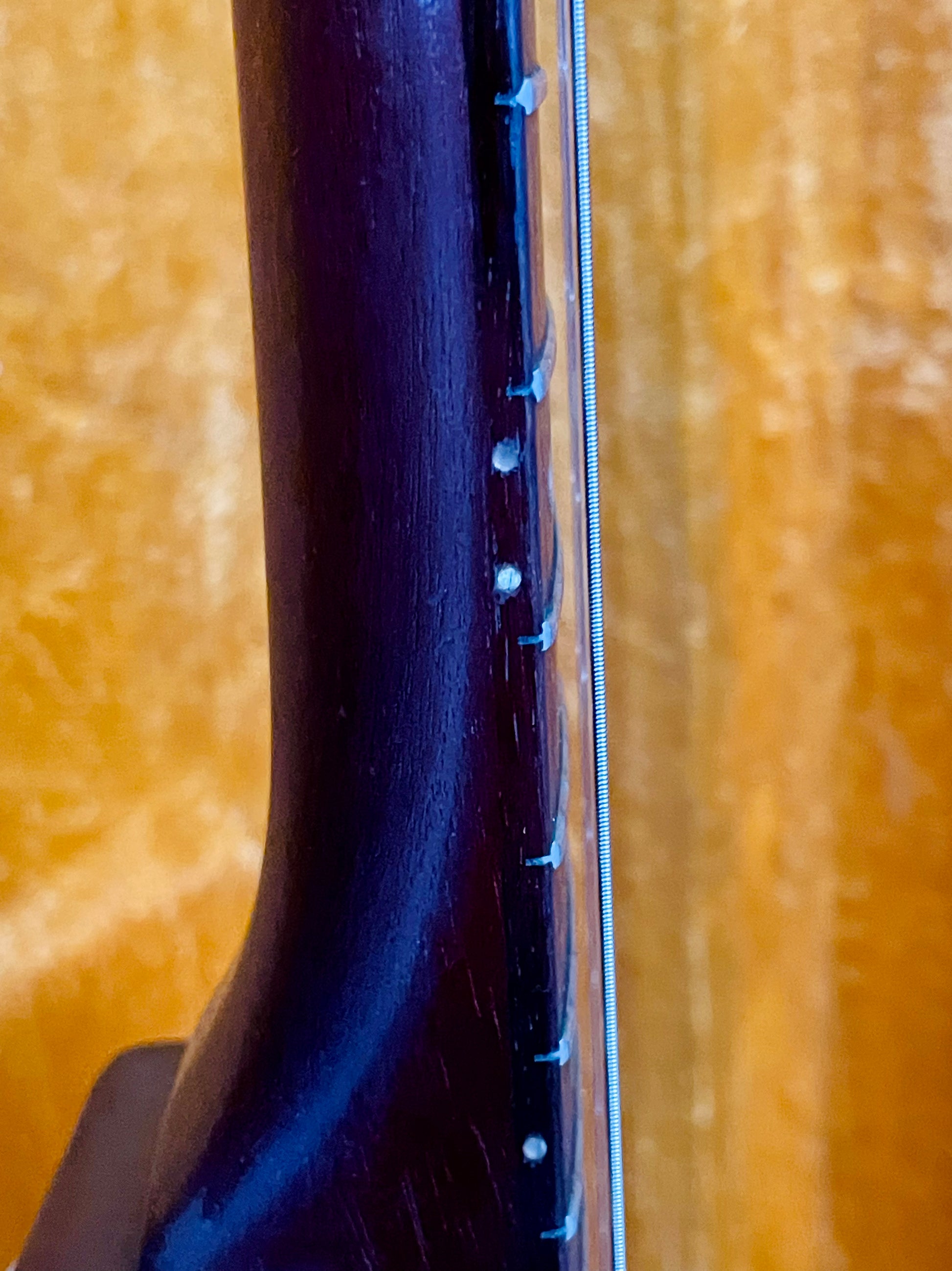 The neck is straight, stable, and plays very well. No dead spots. Action is currently low and comfortable with a fresh set of D’Addario 10–46s. Frets have been polished and still have good life remaining.